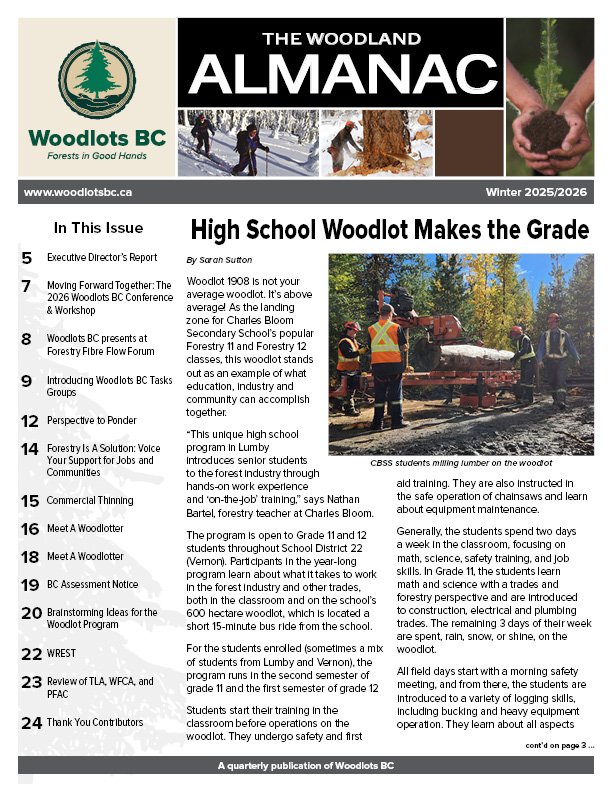 The Woodland Almanac is a quarterly publication of Woodlots BC (Woodlot Product Development Council). If you are interested in advertising, please contact Woodlots BC.